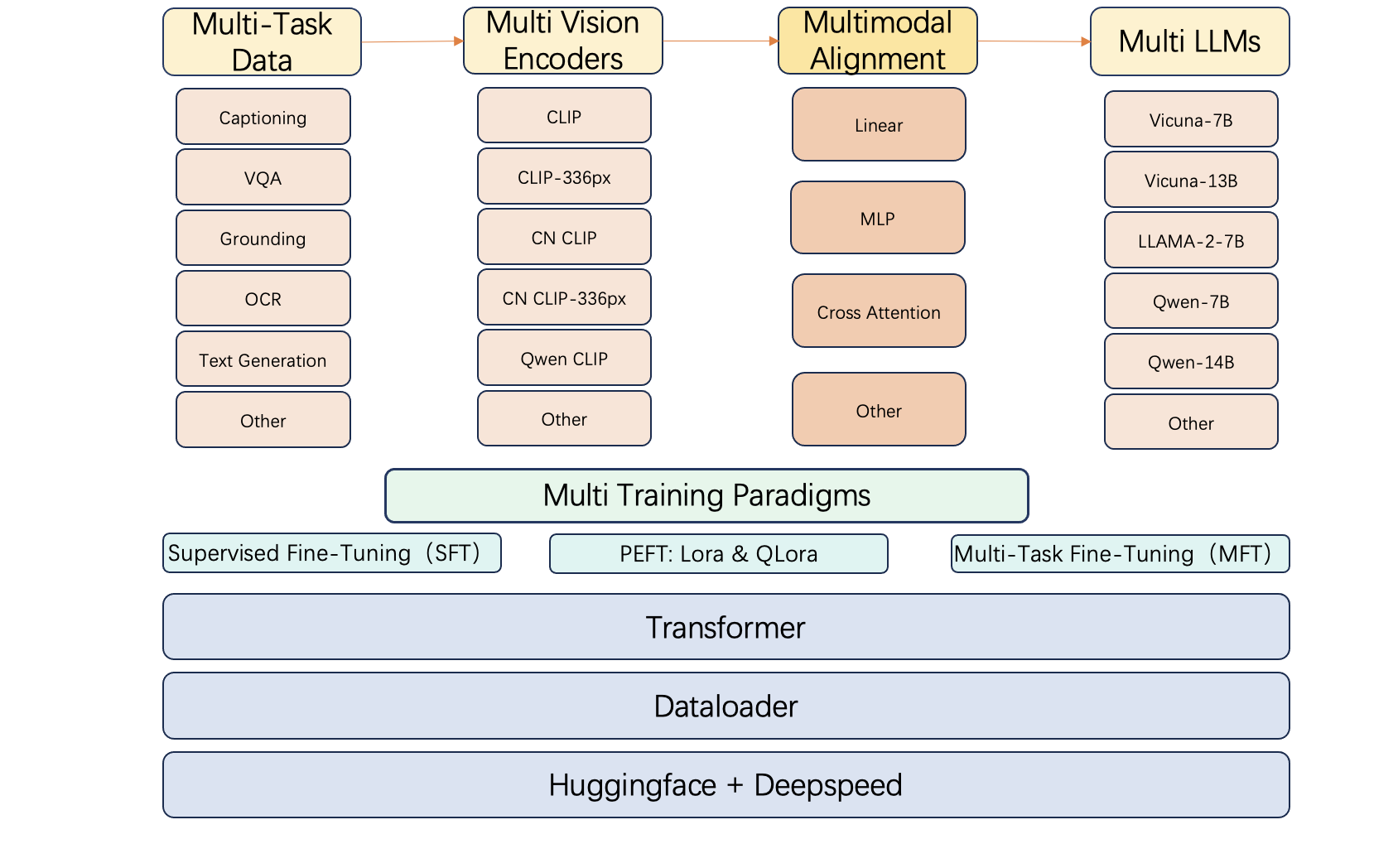CodeFuse-VLM is a Multimodal LLM(MLLM) framework that provides users with multiple vision encoders, multimodal alignment adapters, and LLMs. Through CodeFuse-VLM framework, users are able to customize their own MLLM model to adapt their own tasks. As more and more models are published on Huggingface community, there will be more open-source vision encoders and LLMs. Each of these models has their own specialties, e.g. Code-LLama is good at code-related tasks but has poor performance for Chinese tasks. Therefore, we built CodeFuse-VLM framework to support multiple vision encoders, multimodal alignment adapters, and LLMs to adapt different types of tasks.