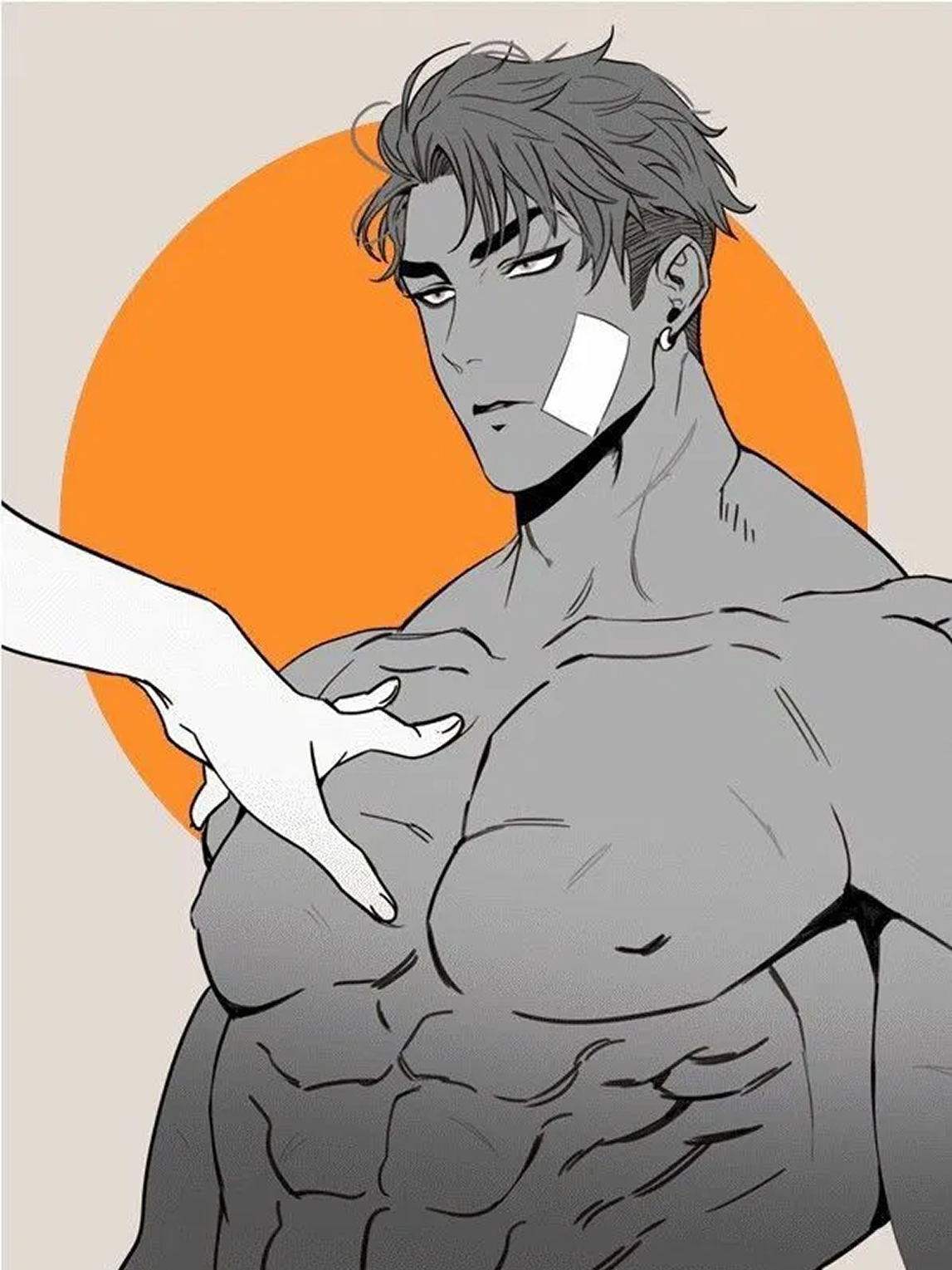 male light colored eyes grey hair muscular shirtless tattoo front on confident intense grayscale anime