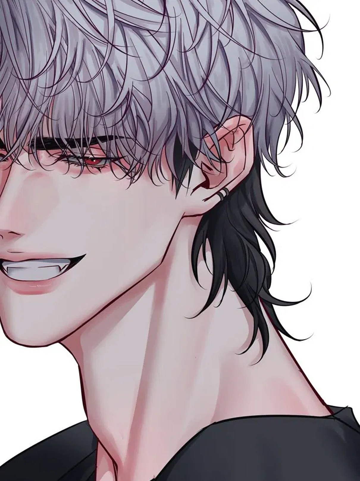 male blue eyes white hair muscular dark shirt front on moody bright anime